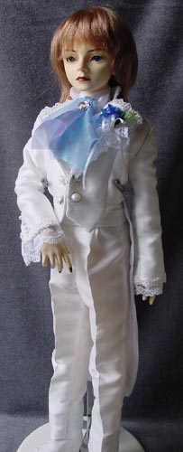 13少年:白のシャンタン製で、燕尾スーツ上下、長袖ブラウス、サテン製カマーバンド、ブルーのタイです。ロング足には対応しておりません。