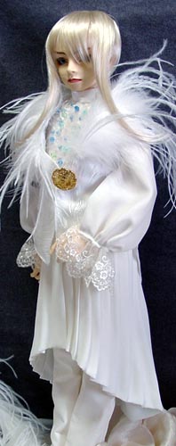 ロングブラウス、フェザーつきロングベスト、パンツ。