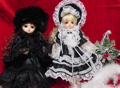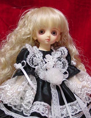 ボンネットを外した胸元は襟無し、いろいろレースで飾ってみました。